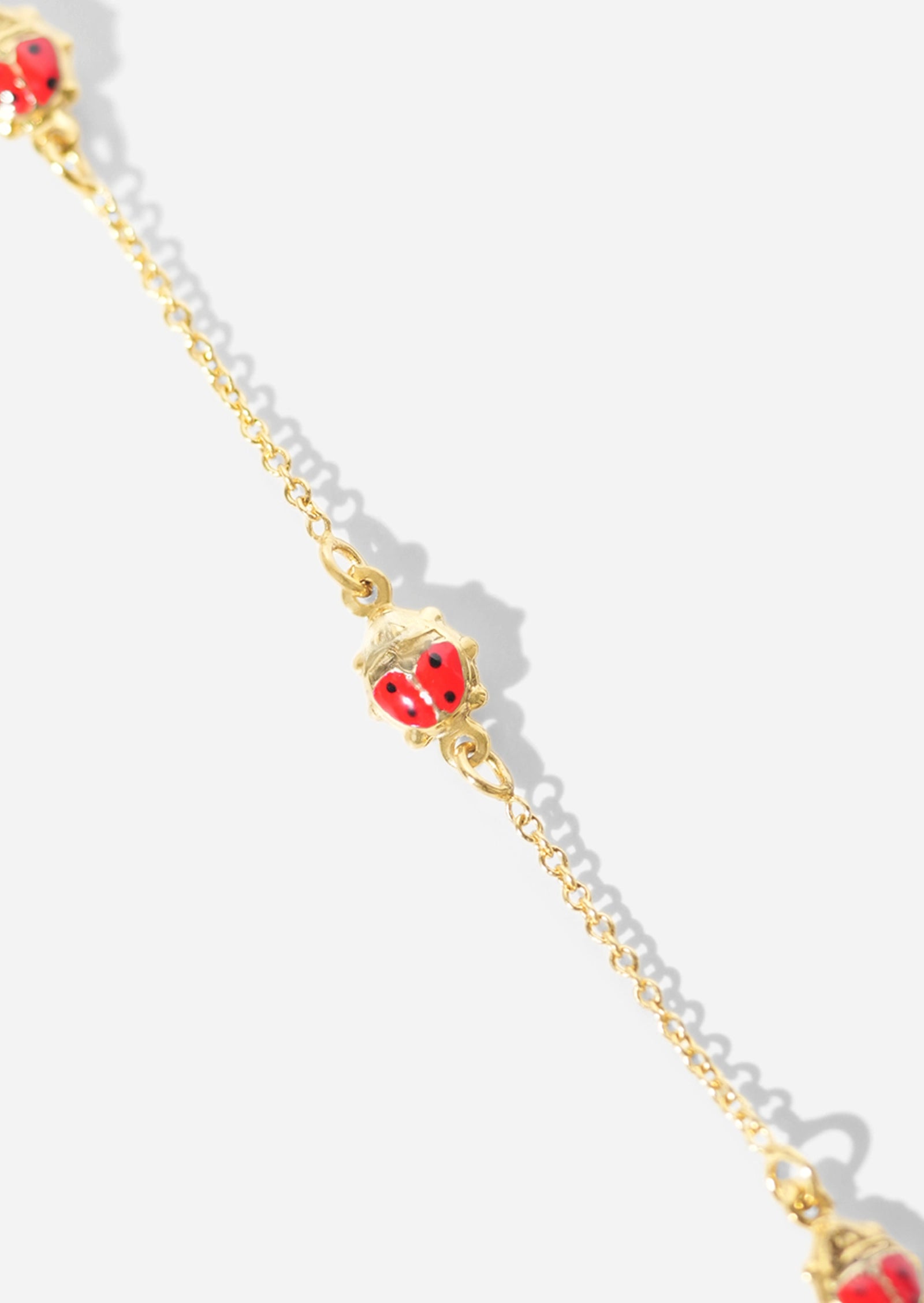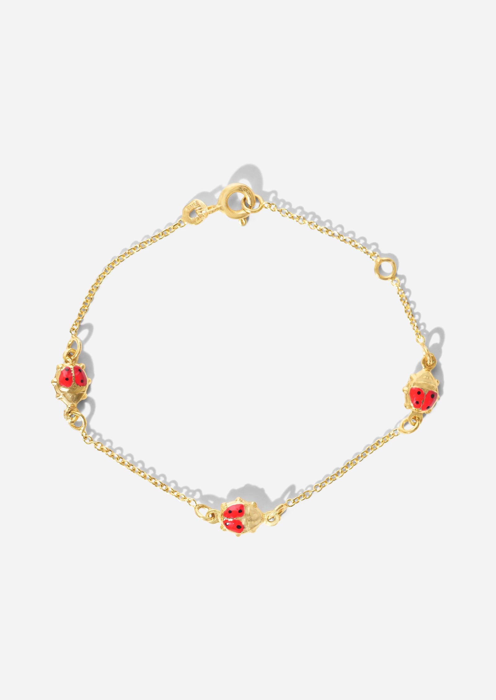 A million moments of motherhood begin with a bracelet. Our heirloom Children's Bracelets are a quiet celebration of childhood and the golden bond between mother and child. A march of sweet enamel ladybugs, gentle protectors and playful companions for the luckiest little one.