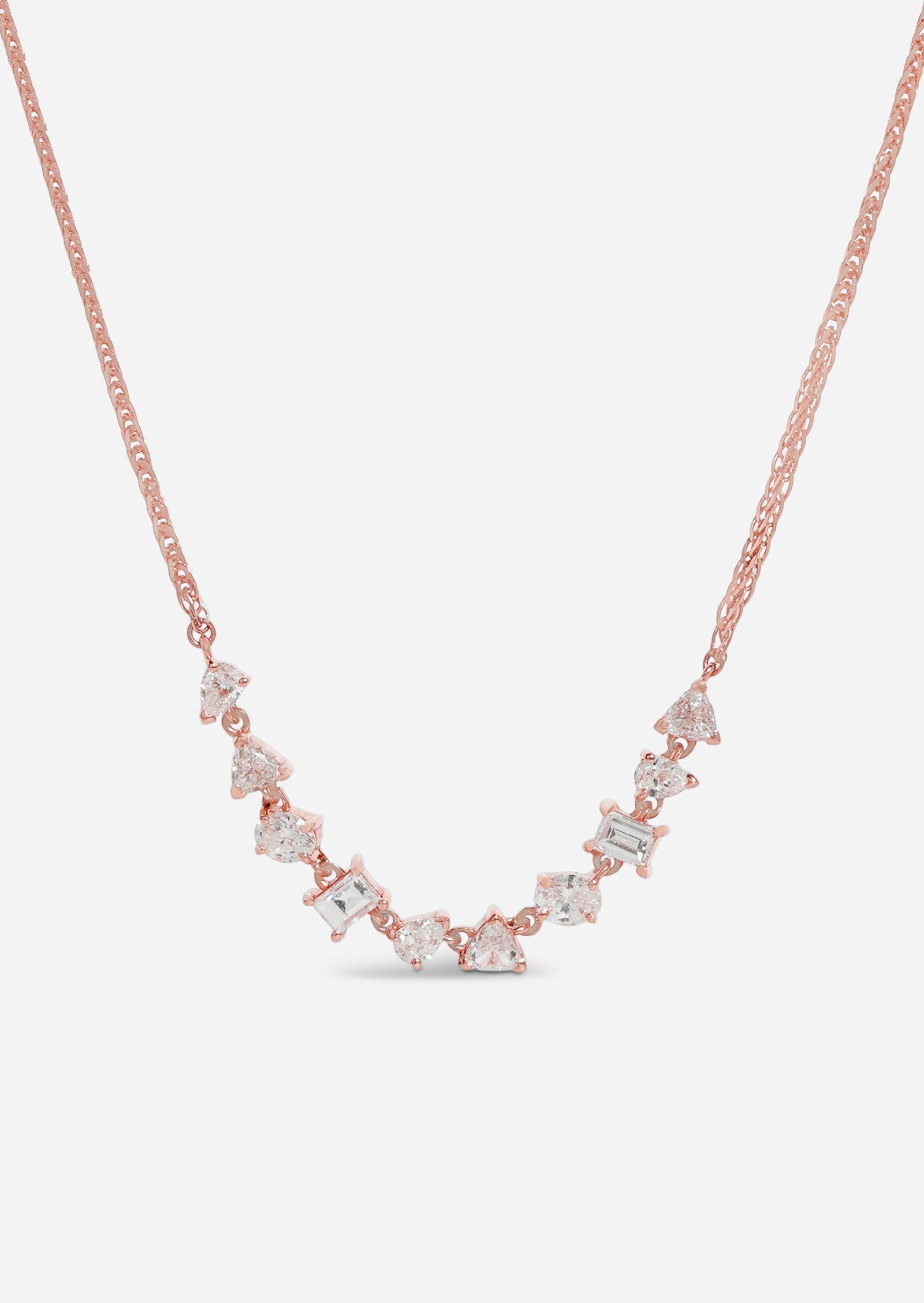 This iconic diamond half-tennis necklace is crafted in a multi-shape scattered diamond style, featuring fancy-cut baguette, trillion, pear, and oval diamonds. An instant heirloom to wear daily and pass down for generations to come.