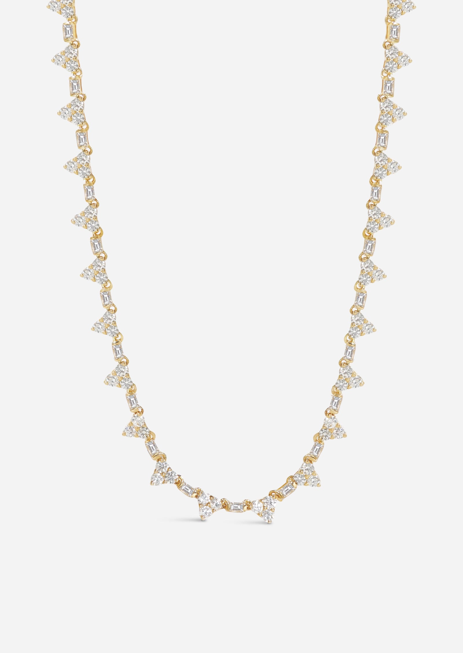 An ultra luxe take on a classic tennis necklace, this Pyramid Necklace features a trio of round diamonds forming a triangular pyramid shape, linked together with baguette diamonds. Upgrade any necklace stack or wear it solo for endless sophisticated shine like no other. A timeless piece guaranteed to become an heirloom for generations to come.