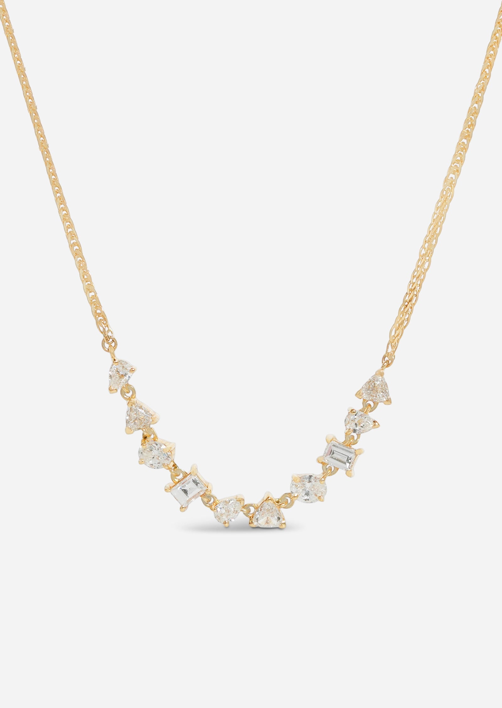 This iconic diamond half-tennis necklace is crafted in a multi-shape scattered diamond style, featuring fancy-cut baguette, trillion, pear, and oval diamonds. An instant heirloom to wear daily and pass down for generations to come.