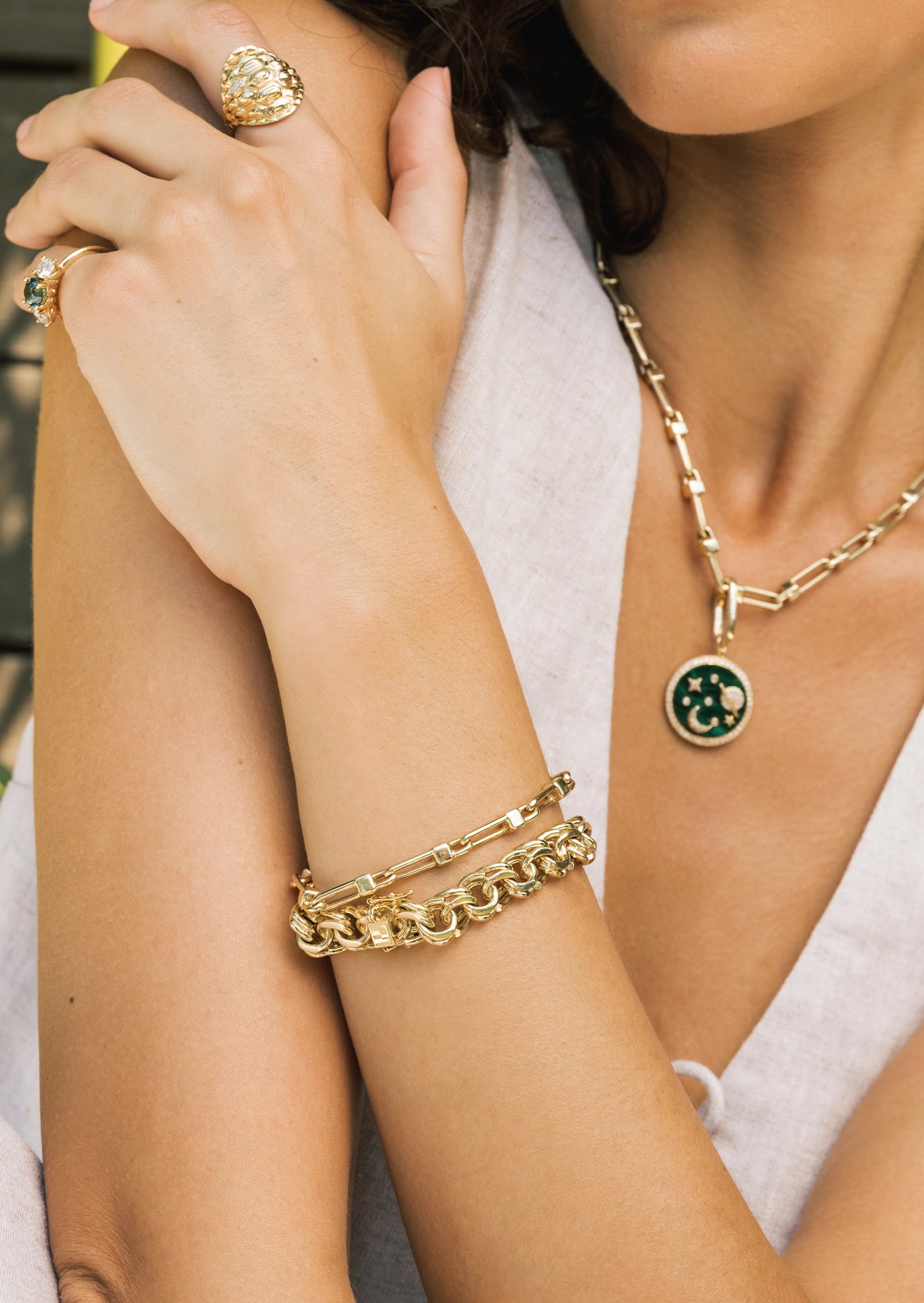 Keep your innermost energy secure with this elongated lock chain bracelet.
