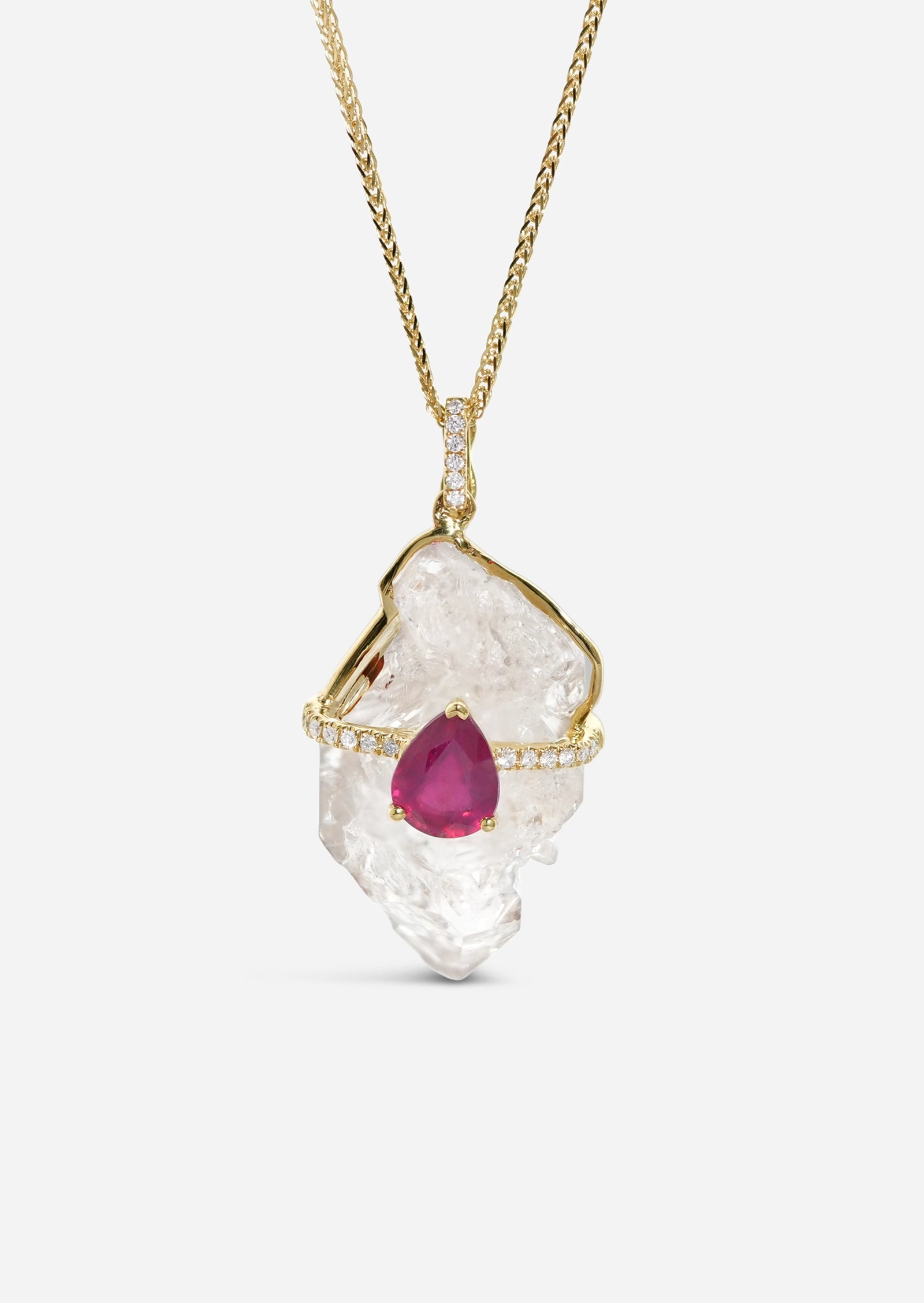 This one-of-a-kind charm features a naturally formed quartz crystal, suspended from a sculptural gold and diamond setting. Anchoring the piece is a pear-shaped ruby set front and center—adding a vivid pop of color against the organic texture of the quartz. The charm's design is completed with a sparkling diamond bale, making it a captivating statement piece that celebrates both natural beauty and artful transformation.