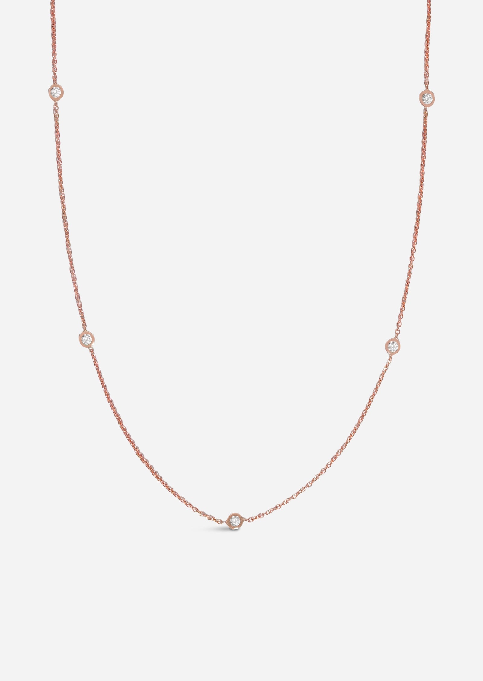 A classic everyday station necklace with 5 round diamonds bezel-set on a delicate rope chain. With two jump rings for varying lengths, this is the perfect necklace to wear alone or stack with other favorites for just the right amount of subtle diamond shine.