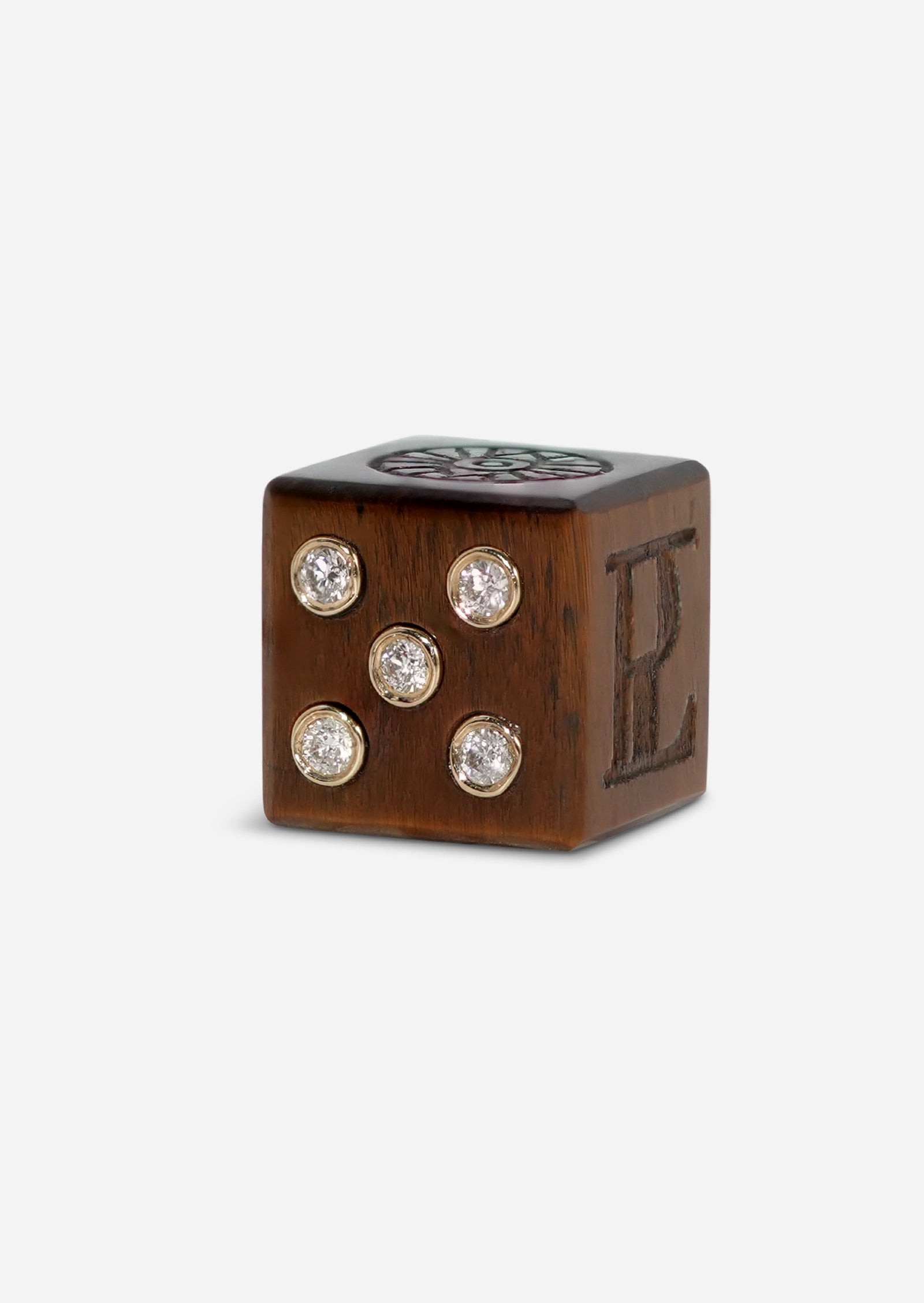 Carved from mysterious Tiger's Eye and inlaid with diamond dots, this lucky die channels the grounding power of nature. The number one is cradled within an evil eye—your guardian as you roll the odds.