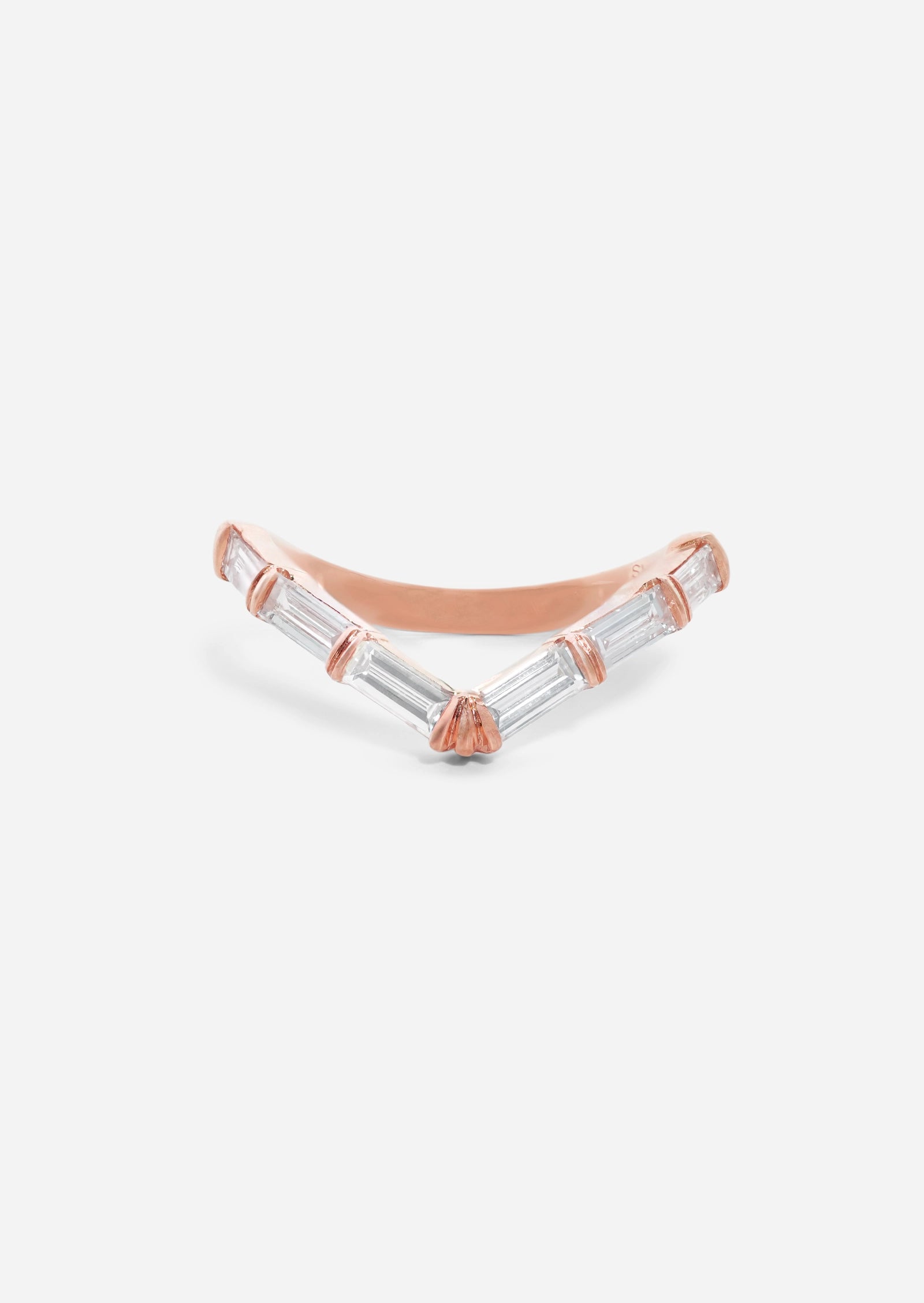 A solid gold band featuring a V shape with baguette diamonds. The perfect daily statement to wear alone or stacked, or as a wedding band paired with your engagement ring. We love to double up and wear this ring above and below an Evil Eye Protector Ring.