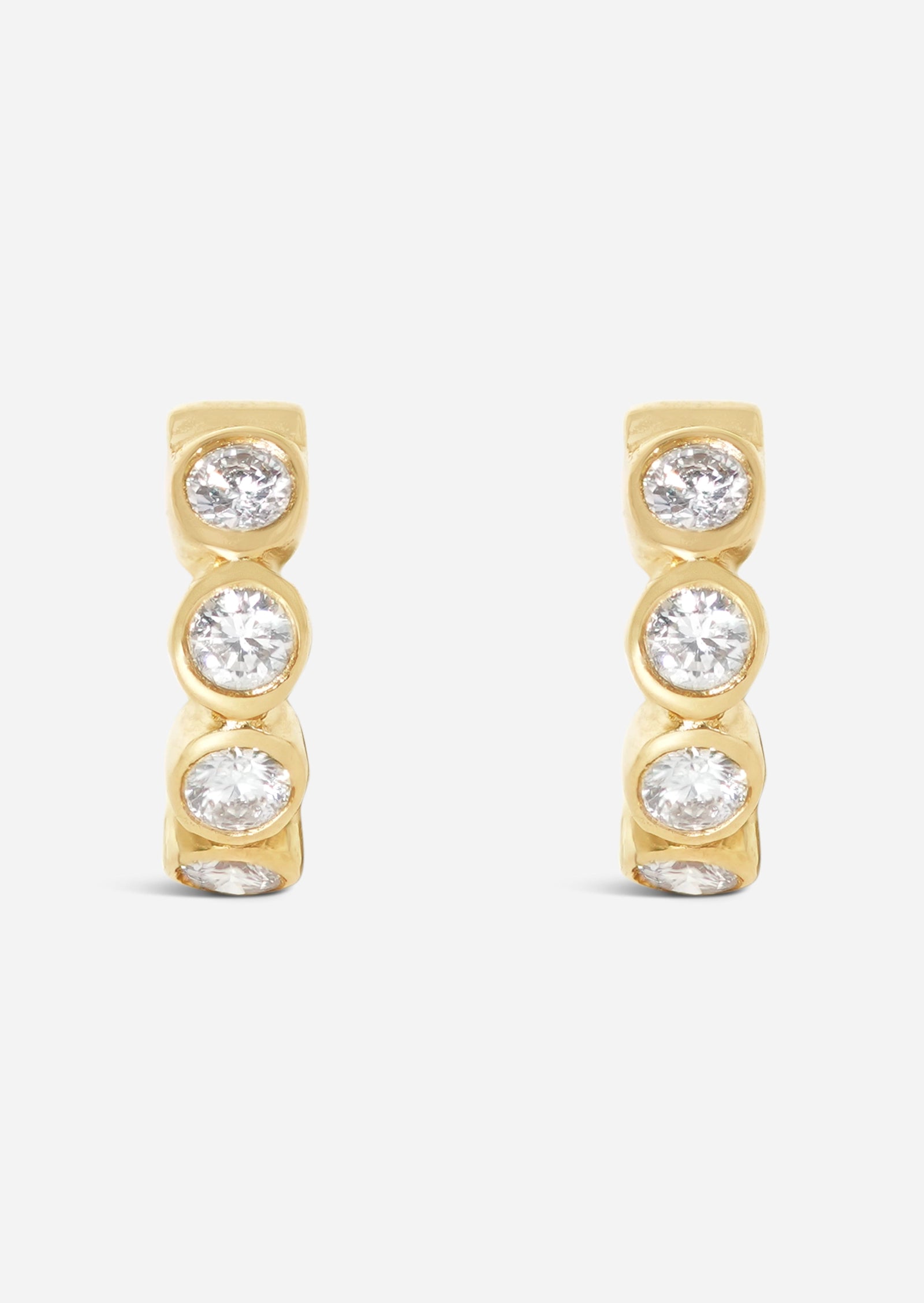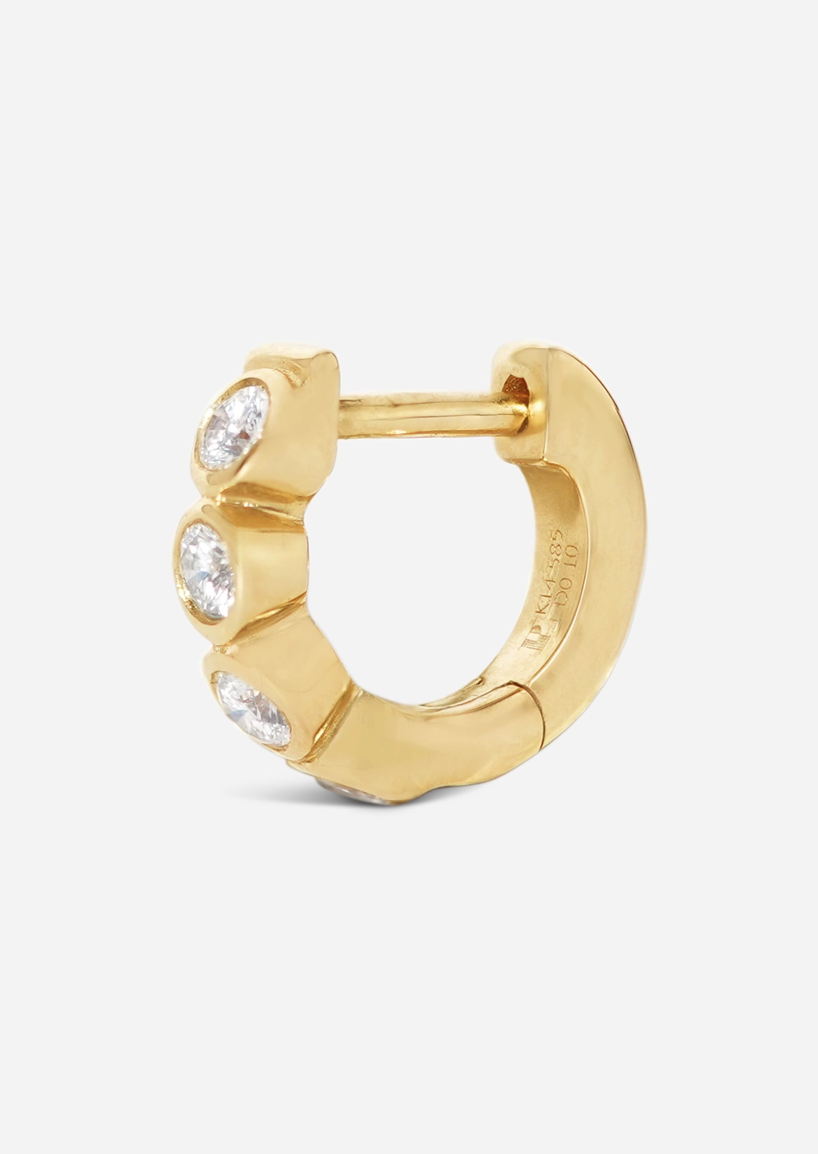 Small hoop, big shine. This bubbly small lock hoop features three bezel-set diamonds along the side in a perfect huggie size. We love wearing this piece in the second or third lobe piercings.