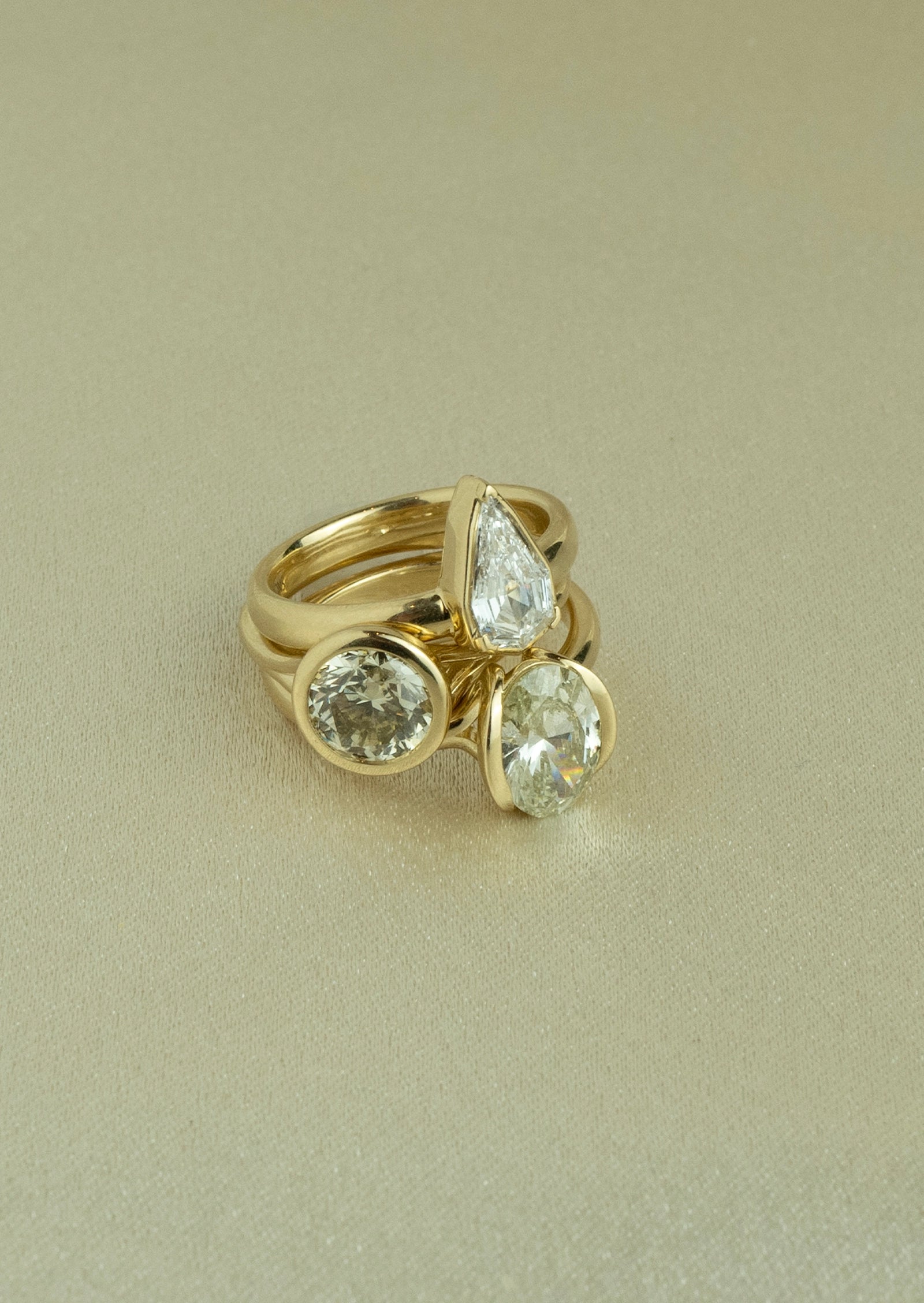 The Laurens ring orbits around a GIA Certified 2.01 carat Oval Cut diamond of L light sea foam green color, VS1 clarity. Set in our signature European-style mount to prevent spinning, the stone rests securely in a modernist design softened by feminine curvature in 14K Yellow Gold. It's a Porter Lyons original, made with love in Louisiana. The ring is currently size 7 and can be resized.
