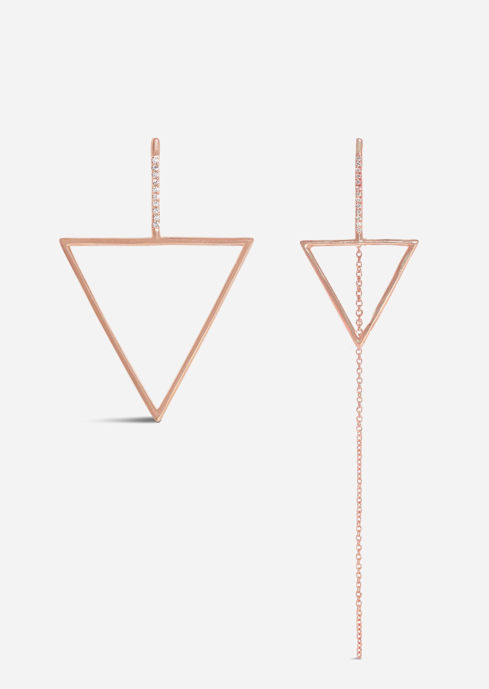 These minimal yet striking asymmetric earrings are a nod to the Ancient Egyptian pyramids. One side features a chain drop dangling from the earring back, which can be worn interchangeably on any butterfly back earrings.