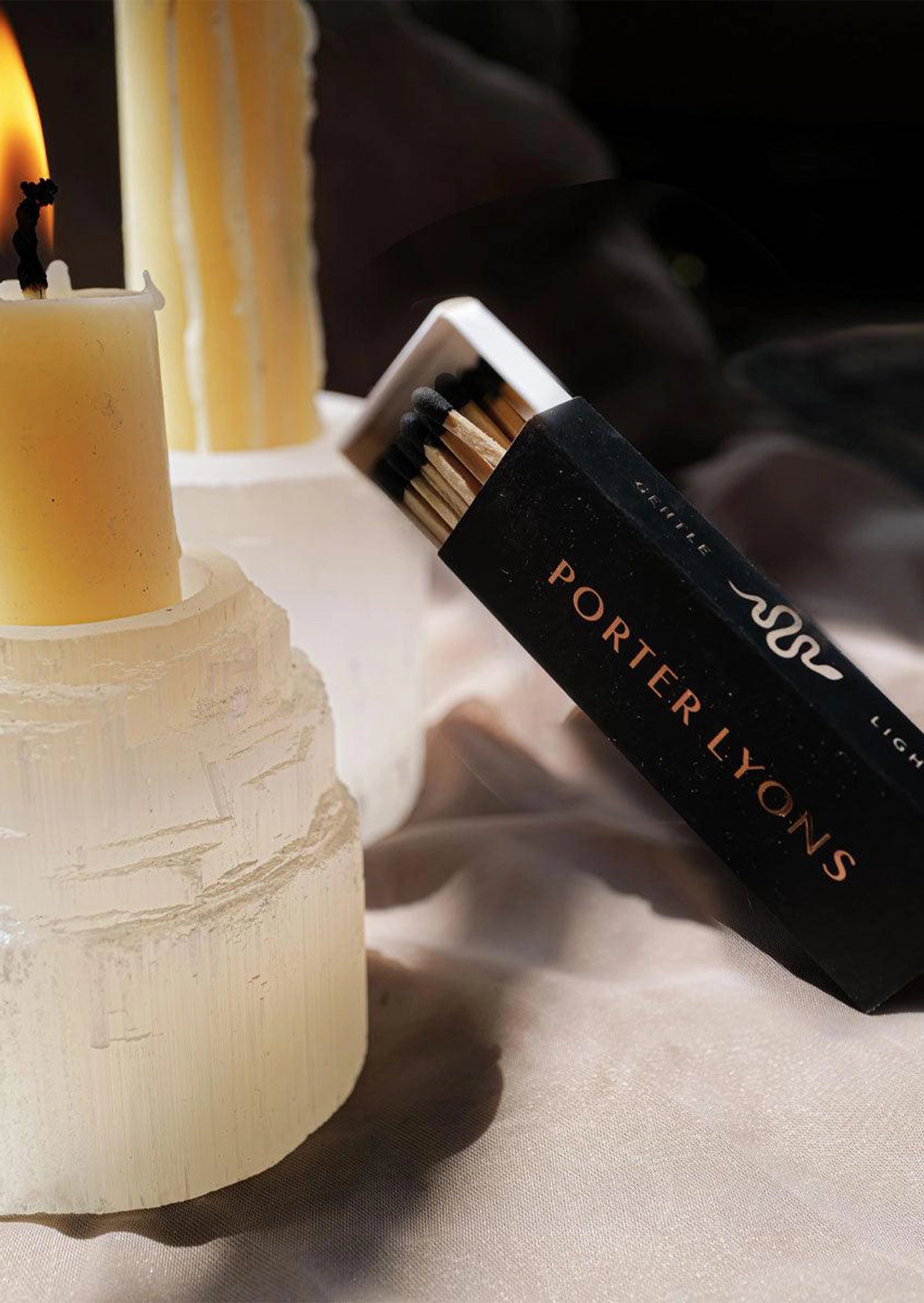 Porter Lyons signature long matchboxes feature wooden, black-tip matches in a rose gold foil box. Gentle light.