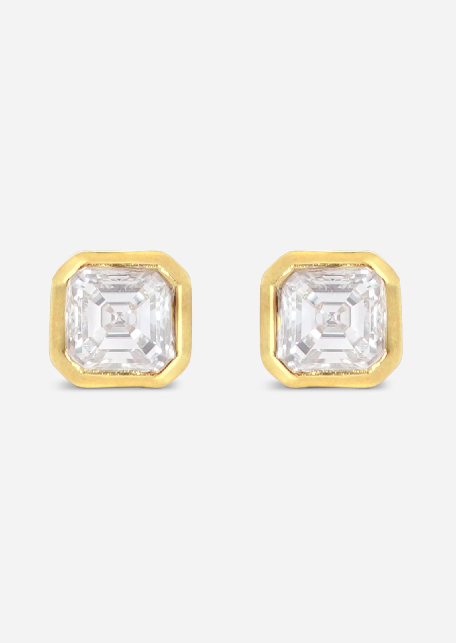 We adore an Asscher cut diamond. Bezel-set in yellow gold, this limited edition earring is a unique upgrade from your classic diamond studs. The elongated facets on an Asscher cut diamond give this piece extra shine and brilliance. We love wearing this small but mighty stud in a flat, upper lobe, or stacked piercing.