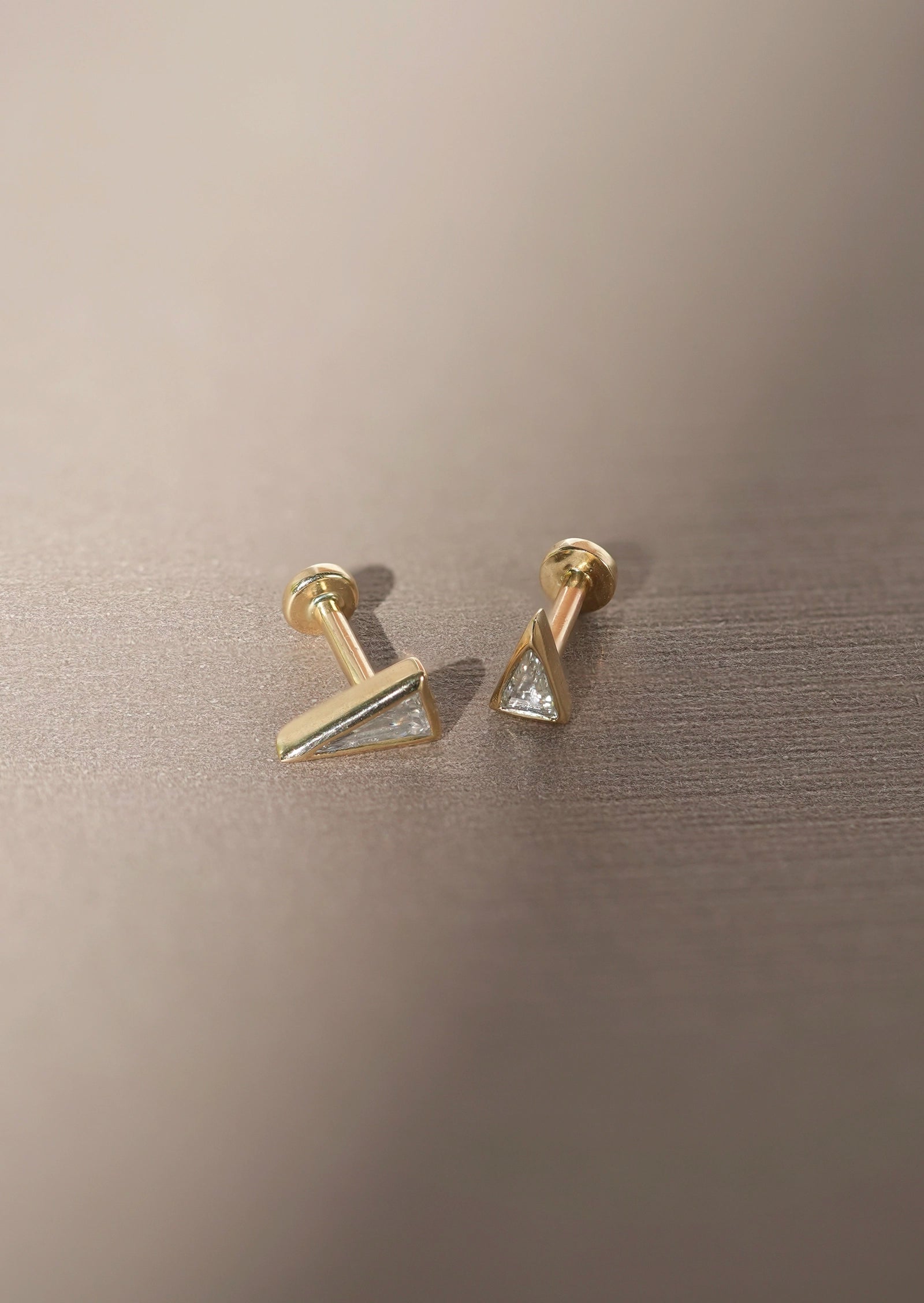 A limited edition triangle-cut diamond bezel-set in yellow gold. Add some geometric edge to your ear stack with this unique alternative to a classic diamond stud. We love styling this piece in the lobe, flat, or conch piercings.
