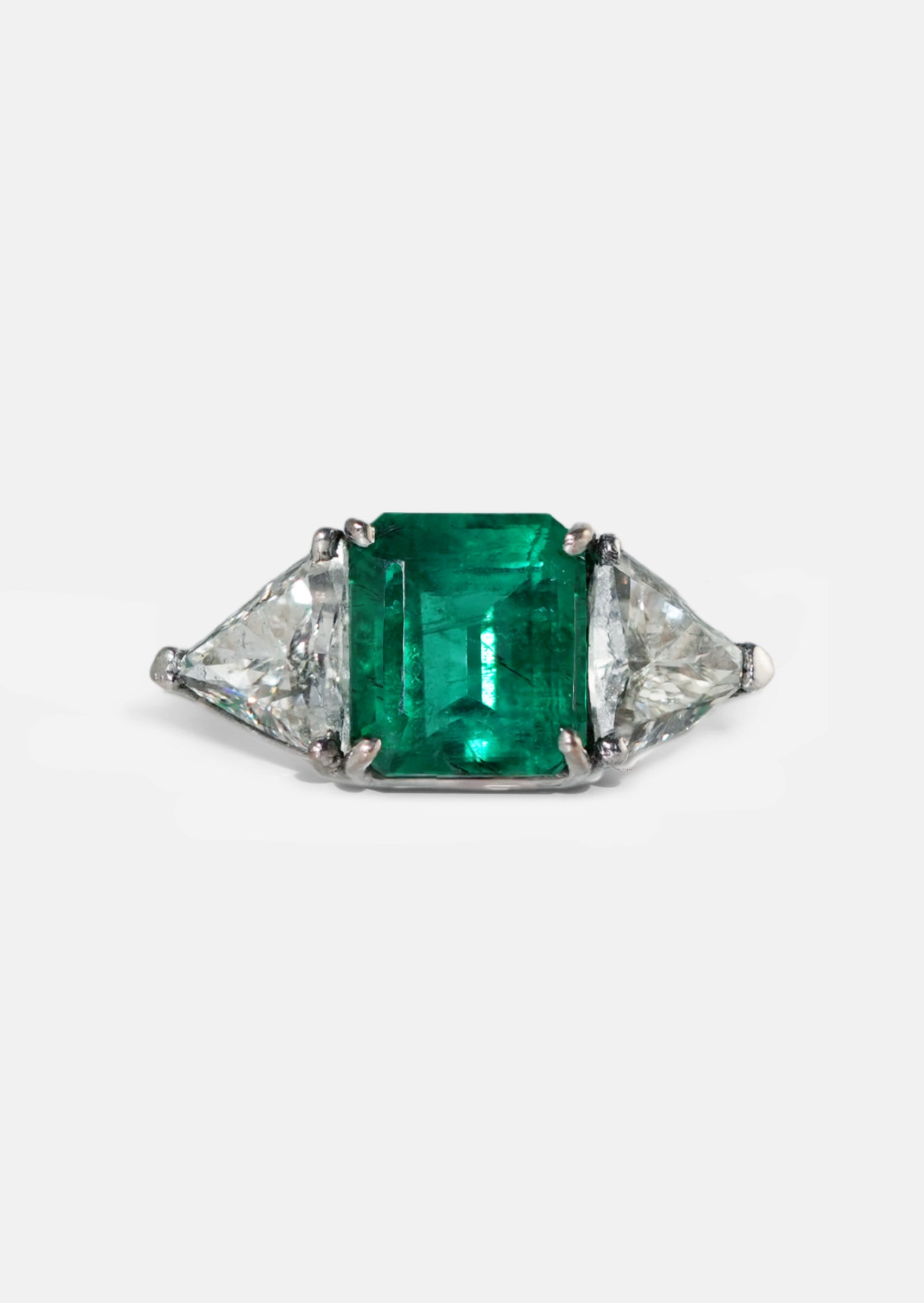 The Emerald Trilogy ring orbits around a rare Russian Emerald Step Cut from the renowned Malysheva mine in the Ural Mountains of Russia. It exudes a deep, captivating, strong saturated green that whispers tales of ancient legends and timeless beauty. Flanking this exquisite gem are two stunning trillion-cut natural diamonds, meticulously set in luxurious 18K white gold.