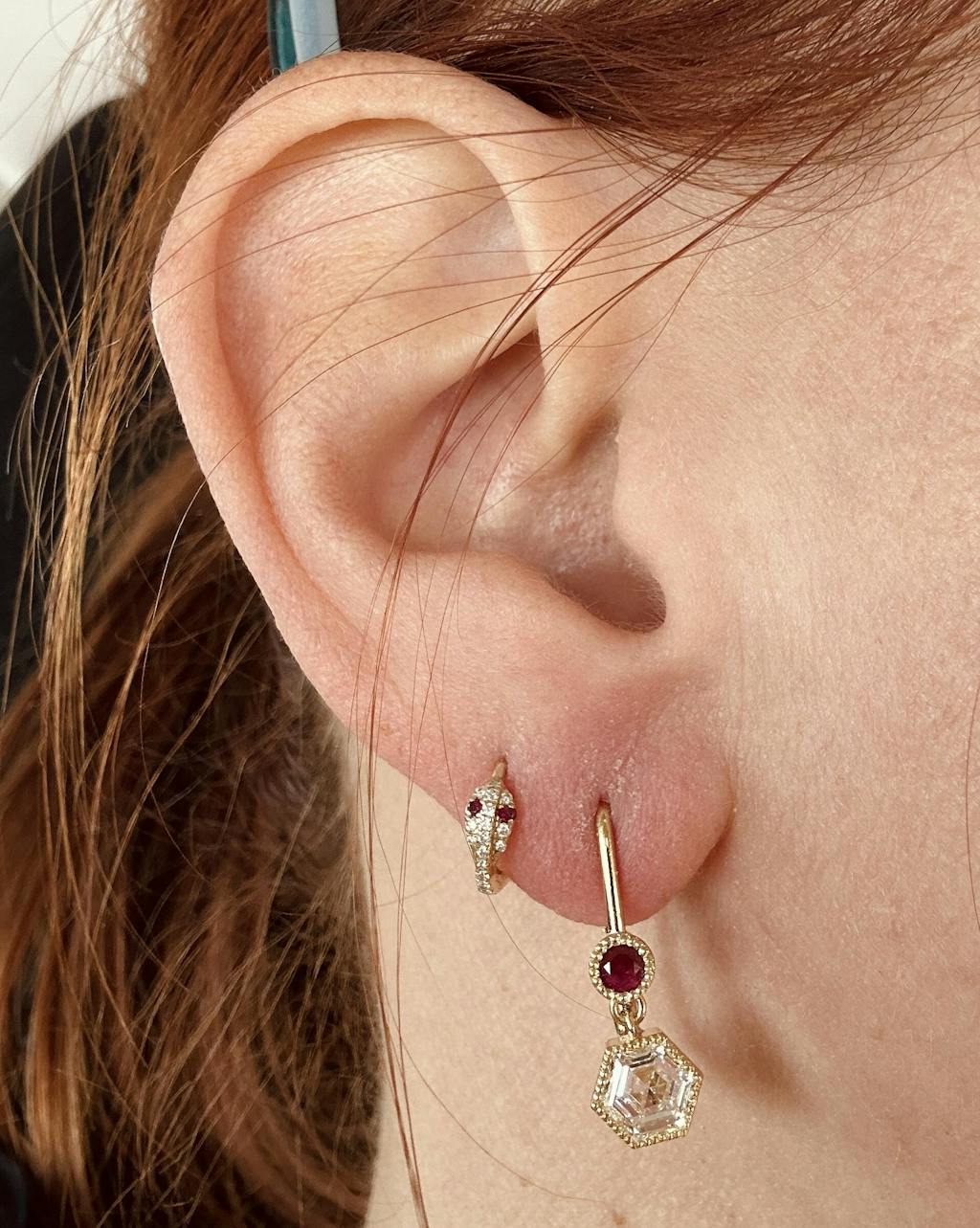 Everyone's favorite hoop just got cuter! Add an extra amount of edge to your ear party with these Mini Diamond Snake Huggies. Lock closure.