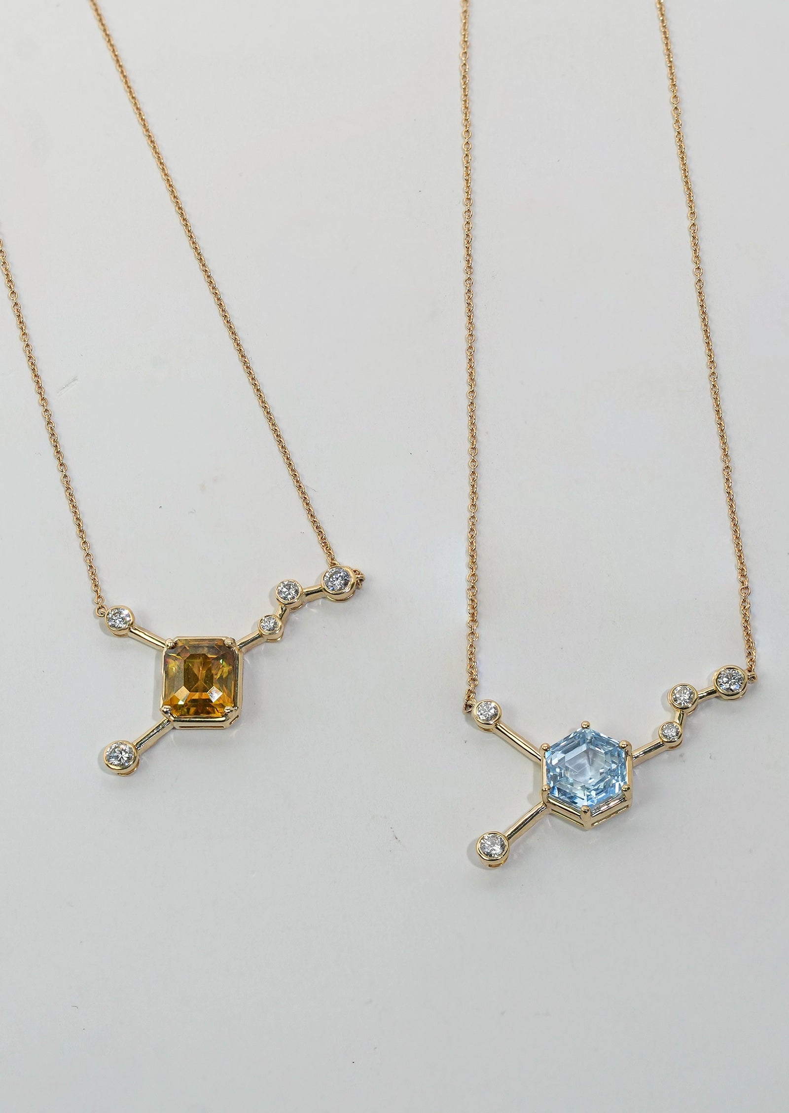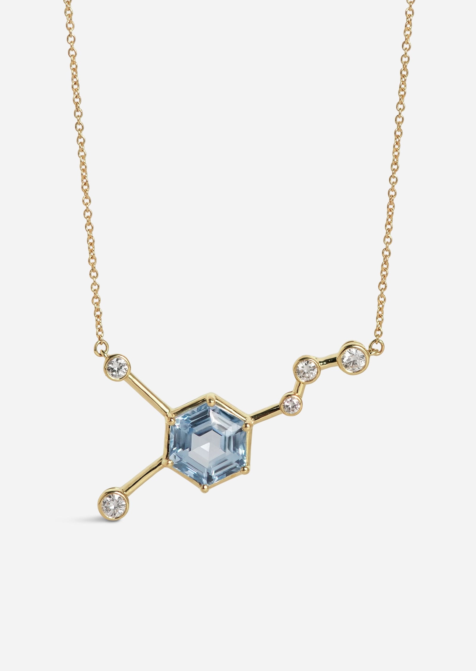 A one-of-a-kind creation featuring the chemical makeup of dopamine, the chemical of pleasure, reward, and motivation, with a hexagonal aquamarine center stone. Often used as a "good luck stone," aquamarine is said to bring feelings of peace + happiness to the wearer, maintaining balance and inspiring courage.