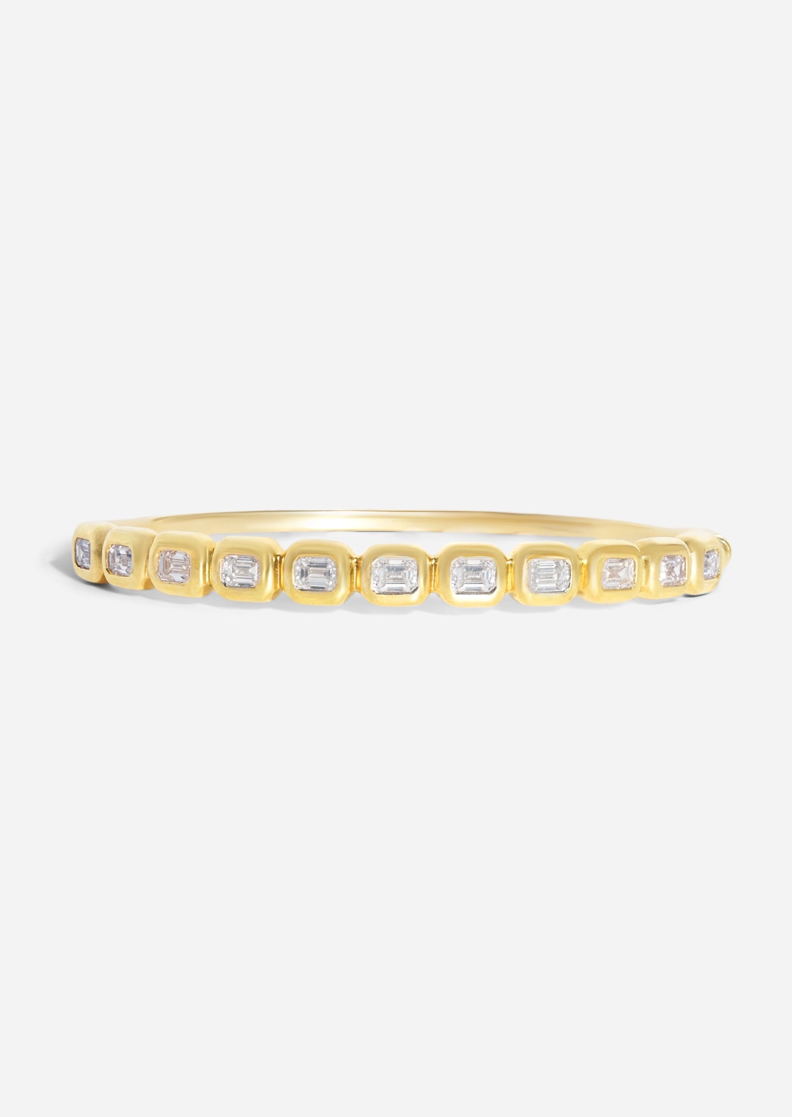 East to west, eleven emerald cut diamonds are precision-set encrusted in gold bezels. Designed for effortless luxury.