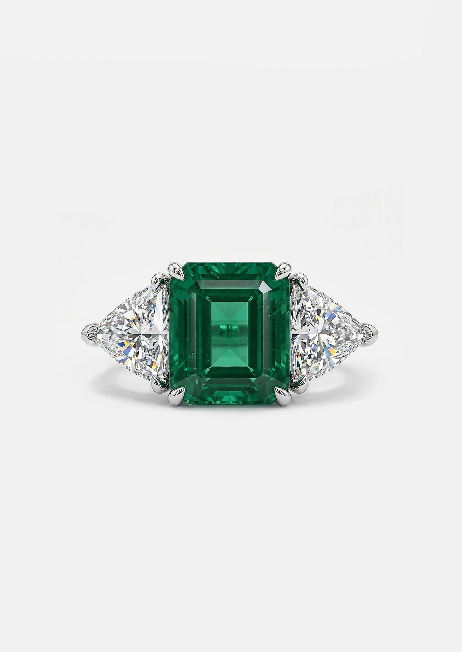 The Emerald Trilogy ring orbits around a rare Russian Emerald Step Cut from the renowned Malysheva mine in the Ural Mountains of Russia. It exudes a deep, captivating, strong saturated green that whispers tales of ancient legends and timeless beauty. Flanking this exquisite gem are two stunning trillion-cut natural diamonds, meticulously set in luxurious 18K white gold.