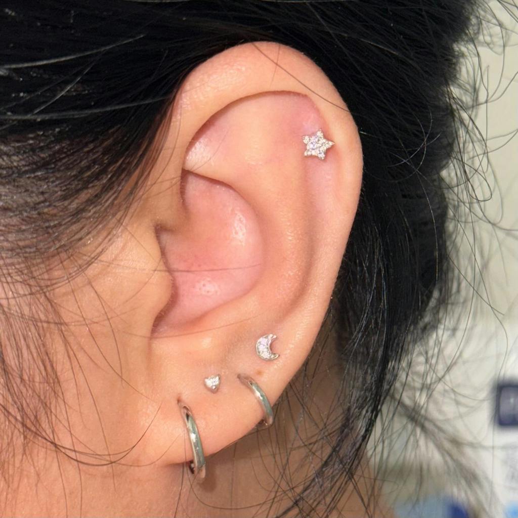 The mini crescent earring with our signature evil eye threaded flat back. The perfect dainty addition to your ear party to leave in and never take out.